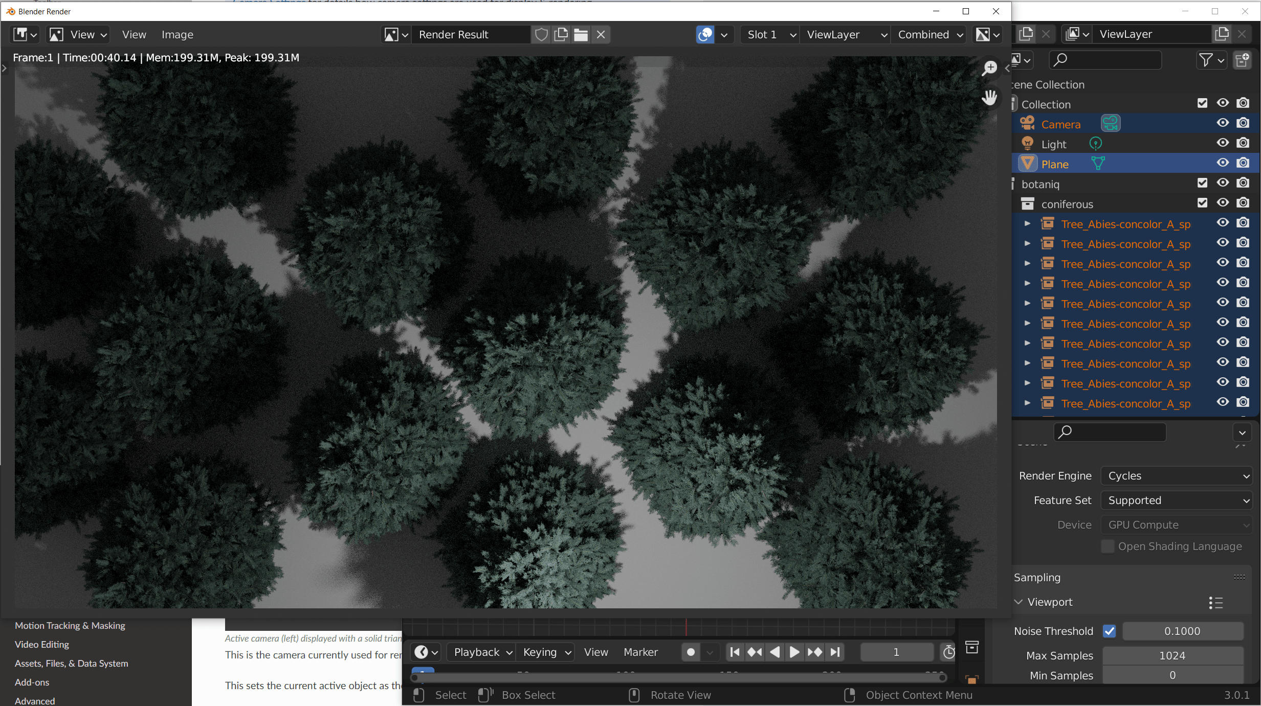 Similarly to the previous example we will use a testing scene with several trees and compare RAM usage when rendering with cycles. In our example we will use CPU rendering with the Cycles renderer. Results are similar when rendering on the GPU with CUDA, Optix or HIP.