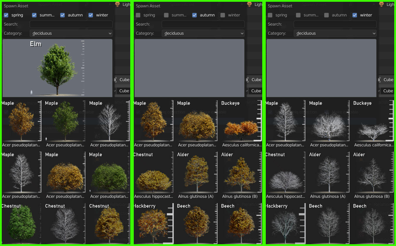To filter assets by seasons tick the desired season boxes. Assets can also be displayed in multiple seasons. For example, some evergreen shrubs will be the same in spring, summer and autumn, so they will appear in all of these seasons.