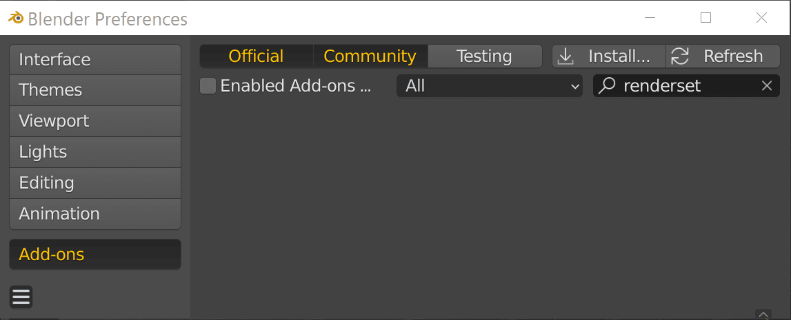 Renderset addon python code and assets are included in one big ZIP file. This entire file has to be installed for the addon to work. First download the ZIP file from BlenderMarket or Gumroad.